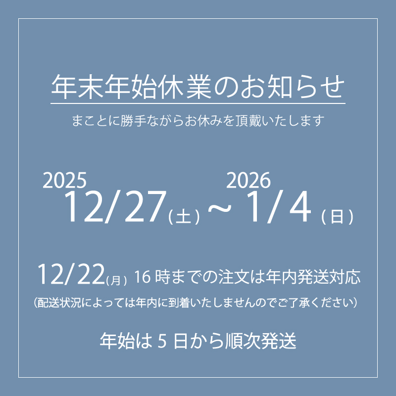 休業明けは、2026年1月5日(月)午前10時より順次ご対応させていただきますが、ご注文やお問い合わせが多く寄せられた場合、ご対応が通常より遅れる場合がございます。
