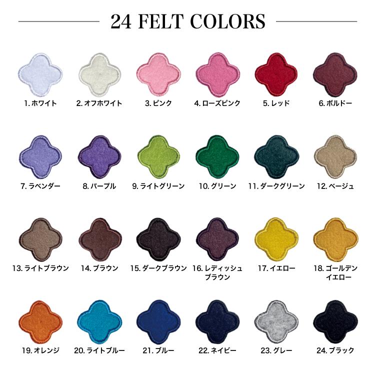 24色からお好きな8色のフェルトパーツと2色の貝パーツをお選びいただけます。