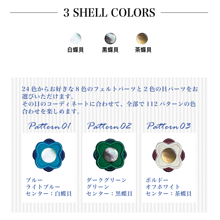 ※フェルトとセンターパーツ(蝶貝)のお好きな色を下記チェックボックスでお選びください。