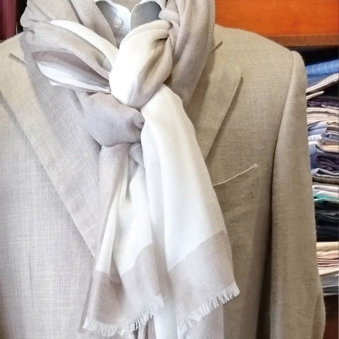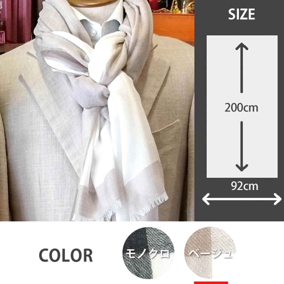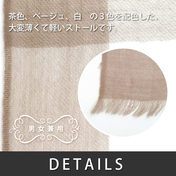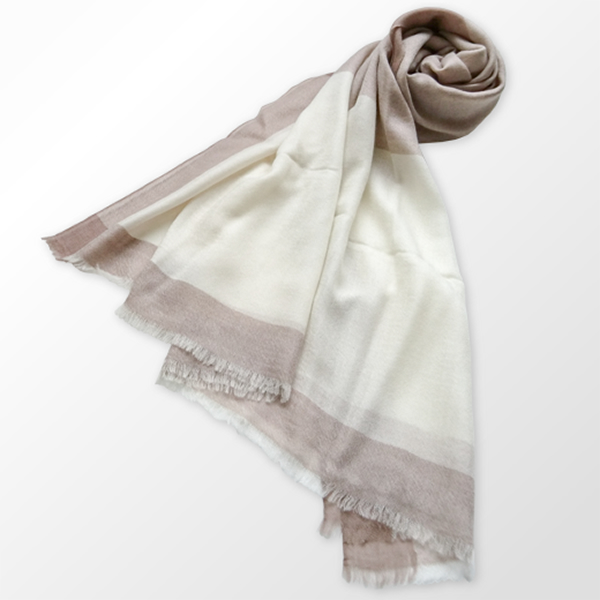 非常に細いカシミヤ山羊の羊毛だけを使った、手触りの良いストールです。生地はきめ細やかで、素材の質感を活かした商品です。茶色、ベージュ、白 の3色を配色した、大変薄くて軽いストールです。